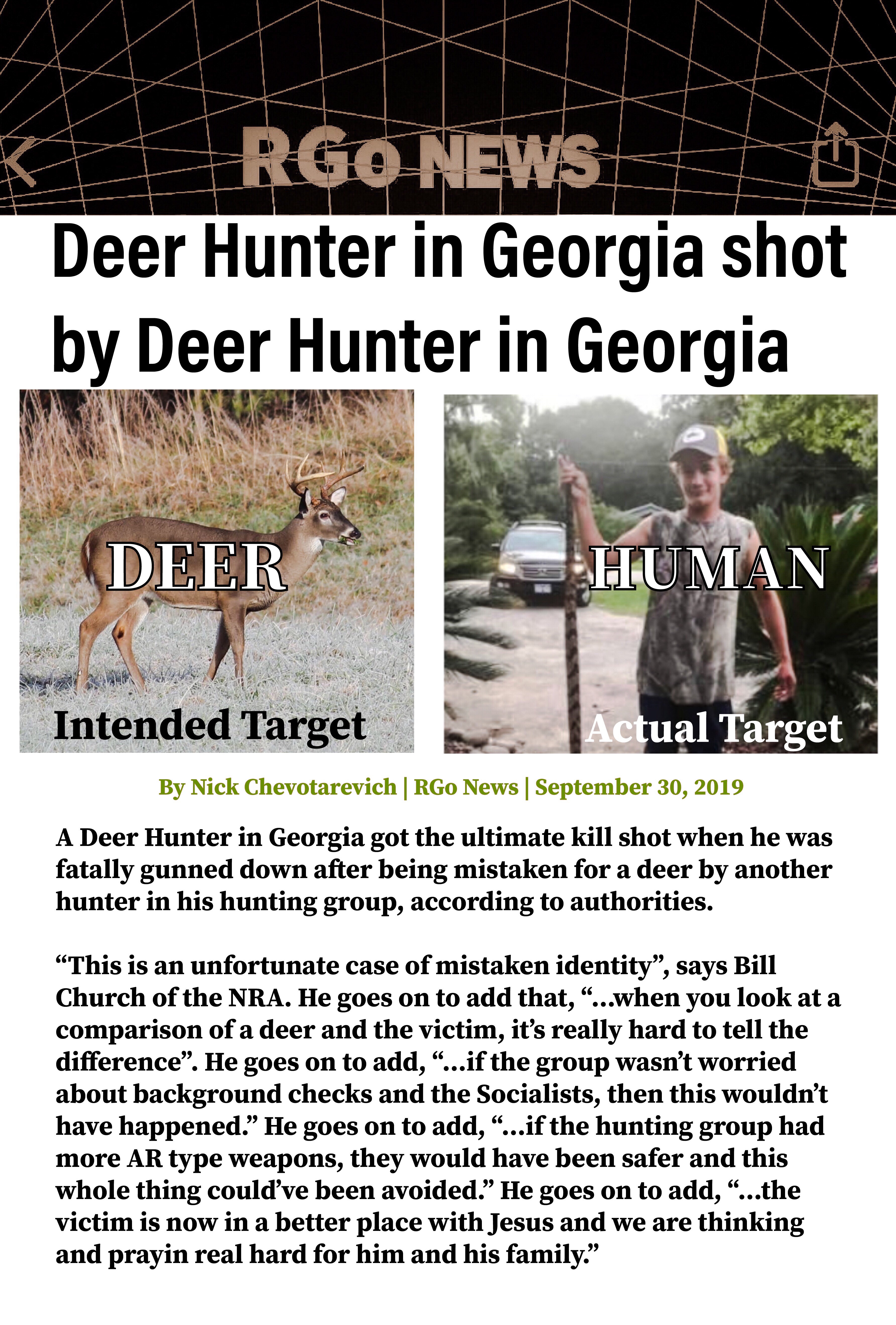Posted on September 30, 2019 by russiangoatRGo News 5.9 Correction: Bill Church clarified to RGo that the Hunter killed was not a “victim” but rather a “hunter ” Share this: Click to share on X (Opens in new window) X Click to share on Facebook (Opens in new window) Facebook Like Loading...